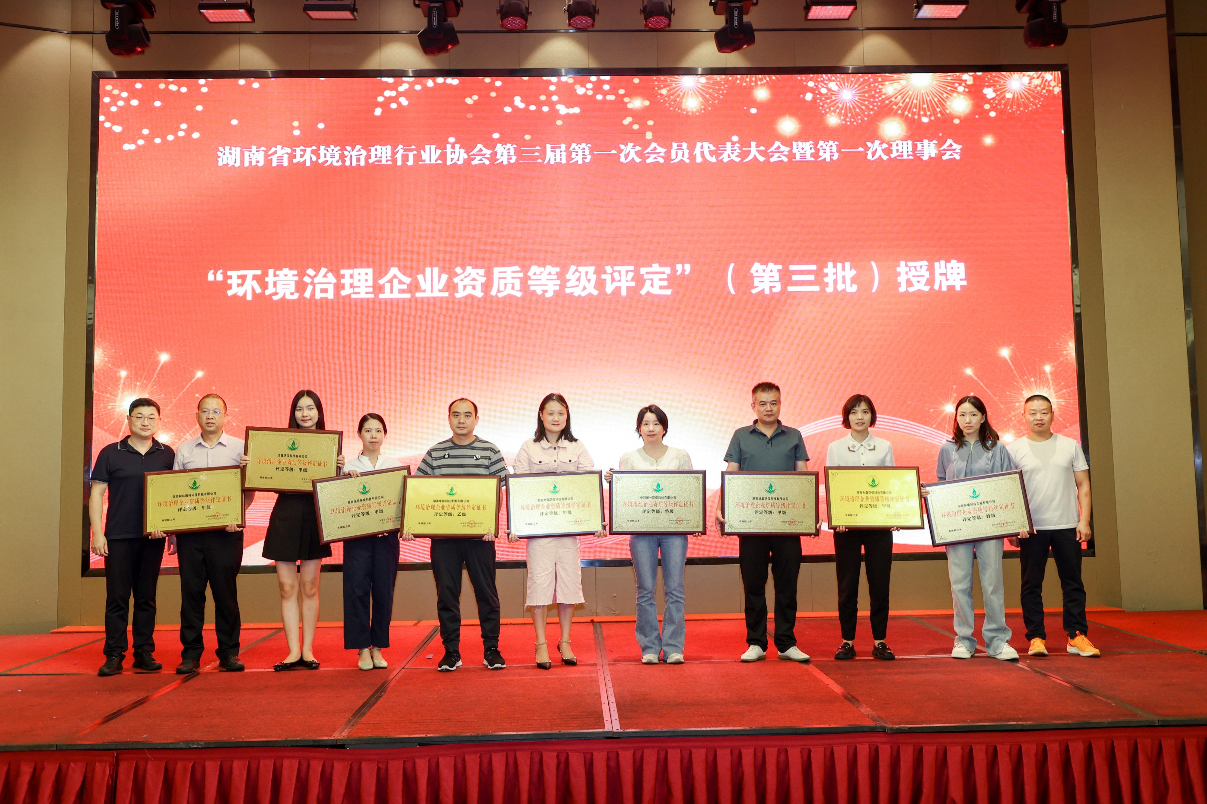 根據《環境治理企業資質等級評定標準》的規定,通過申請提交相關申請材料,經評定機構組織人員完成對我司的申請材料的初審、專家評定等程序,我司評定等級為“甲級”。并在本次會議中授牌。 并榮獲了:“湖南環境治理行業優秀會員單位”榮譽